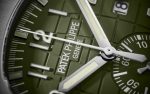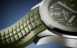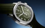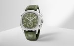 New Patek Philippe Aquanaut Chronograph luxury sports watch, 42,2mm, 18k White Gold, Ref. 5968G-010. The first chronograph with a flyback function in the modern Aquanaut sports collection, which perfectly matches the character of this young and dynamic watch line. His 18k White Gold rounded, pillow-like octagon-shaped case and gently curved ears are unmistakable. On a beautiful Khaki green dial with embossed embossing, perfectly readable large applied polished Arabic numerals made of 18k White Gold with luminescent coating in the form of hour markers look harmoniously. The manufacturer paid special attention to the second track on the outer rim of the dial. She is applied in long and short silvery lines with fairly wide luminous marks located every 5 minutes. Large polished luminous hour and minute hands in 18k White Gold indicate the time. These are complemented by a slim and elegant chronograph second hand (Sweep seconds hand). At the 6 o’clock position, there is a recessed green auxiliary chronograph counter with reverse movement repeating which follows the rounded octagonal shape of the bezel. It has glowing white Arabic numerals, white markers, and a white indicator needle. The date window is traditionally at the 3 o’clock position. Rectangular 18k White Gold buttons located on the right side of the case control the chronograph. At the 8 o’clock, position on the case is an instant date corrector. A polished 18k White Gold screw-down crown with a ribbed edge for a comfortable grip and the Patek Philippe logo is the finishing touch to the perfect picture. The dial is covered with a scratch-resistant sapphire crystal. The screw-down case back is also made of sapphire crystal, which allows you to see the magical work of the movement. Against this backdrop, a flat, fixed bezel in 18k White Gold, vertically ground on the front and polished on the sides, provides a wide view of the dial. The finish on the side of the bezel is amazing because at first glance, it looks rounded, but upon closer inspection, you can see the crisp edges playing with the light. The model is equipped with a Patek Philippe caliber CH 28‑520 C with a self-winding mechanical movement containing 32 jewels and a power reserve of min. 45 hours – max. 55 hours. This beautiful sport chic watch is presented on a Khaki green tropical rubber strap. This new composite material is highly resistant to wear, salt water and UV radiation. The strap are fastens with Patek Philippe’s patented 18k White Gold folding clasp, polished and engraved with the Calatrava cross. Opening the clasp reveals the engraved Patek Philippe logo with the word GENEVE. Water resistant up to 120m/394ft (12 ATM).