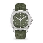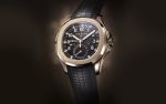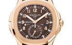 New Patek Philippe Aquanaut Travel Time luxury sports watch, 40,8mm, 18k Rose Gold, Ref. 5164R-001. They are reliable and practical, modern and somewhat unexpected, inspired by Nautilus. Their 18k Rose Gold case features a rounded, cushion-shaped octagon that is unmistakable. It has polished crown guards protruding from the right side of the watchcase to protect her. The beautiful embossed brown dial is one tone lighter than the strap, which has the same geosphere pattern. This color combination of dial and strap is the main attraction of this model. Perfectly readable large applied polished Arabic numerals made of 18k Rose Gold with luminescent coating in the form of hour markers look harmoniously. On the outer rim of the dial, a silver second track is printed with fairly wide luminous marks located every 5 minutes. The local time is indicated by large polished luminous 18k Rose Gold hour and minute hands, as well as a thin and elegant second’s hand (Sweep seconds hand). In addition, this model has an additional skeleton hand, which indicates the time of the second time zone. She can be controlled using rectangular 18k Rose Gold buttons on the case. The first, which is at 8 o’clock moves the second time zone hand forward in one-hour increments, while its twin at 10 o’clock moves the same hand back. There are small day/night apertures at 9 and 3 o’clock positions for both time zones, and a subdial date counter is visible at 6 o’clock. A polished 18k Rose Gold screw-down crown with a ribbed edge for a comfortable grip and the Patek Philippe logo is the finishing touch to the perfect picture. The dial is covered with a scratch-resistant sapphire crystal. The case back is also made of sapphire crystal, which allows you to see the magical work of the movement. Against this backdrop, a flat, fixed bezel in 18k Rose gold, vertically ground on the front and polished on the sides, provides a wide view of the dial. The finish on the side of the bezel is amazing because at first glance, it looks rounded, but upon closer inspection, you can see the crisp edges playing with the light. The model is equipped with a Patek Philippe caliber 26‑330 S C FUS with a self-winding mechanical movement containing 29 jewels and a power reserve of min. 35 hours – max. 45 hours. This beautiful sport chic watch is presented on a Dark Brown tropical rubber strap, made from a new composite material that is ultra-resistant to wear, salt water and UV radiation. It fastens with Patek Philippe’s patented 18k Rose Gold folding clasp, polished and engraved with the Calatrava cross. Opening the clasp reveals the engraved Patek Philippe logo with the word GENEVE. Water resistant up to 120 m/394ft (12 ATM).